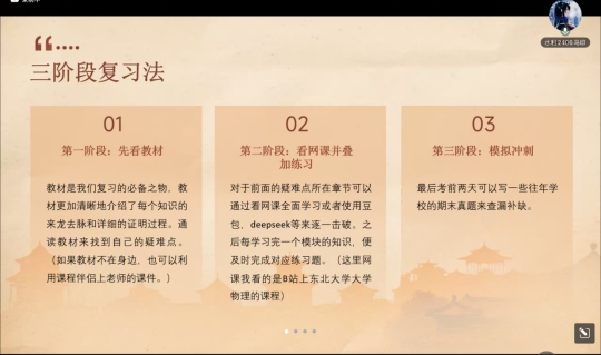 “学霸小课堂”按科目特点分时段开课,线上课堂干货满满。大学物理专场参与度最高,水利类2406班马印以“三阶段复习法”为核心展开讲解,一打开PPT,“三阶段复习法”的清晰框架便吸引了所有人的注意力。“第一阶段先啃教材,把每个知识点的来龙去脉搞清楚,比如刚体转动,要先理解转动定律的推导过程,而不是死记公式。”马印边点击PPT边讲解,遇到“光的干涉”“非特殊角计算”等重难点时,他特意放慢语速,鼠标在公式推导步骤上逐行停留......“大家看这里,光栅常数的数值变化会影响衍射条纹间距,我给大家举个改了数据的例题,咱们一起算一遍。” 有同学在评论区提问:“选择填空题总出错怎么办?”,马印立刻结合考场经验支招:“选择填空大多是基础题,别着急赶速度,哪怕别人提前交卷也别慌,我当时会把计算过程在草稿纸上写清楚,避免粗心。”屏幕另外一头的同学纷纷回复“学到了”“谢谢”,互动的暖意透过屏幕传递开来。