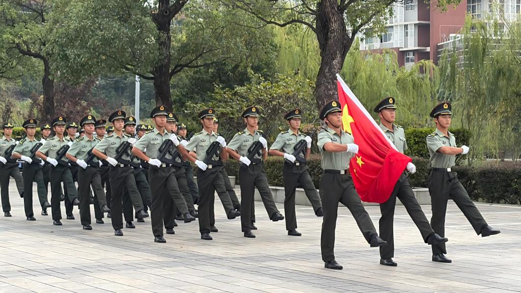 7点整,护旗队迈着整齐划一的步伐,将国旗护送到升旗台前。在庄严的国歌声中,五星红旗冉冉升起,全体师生齐声歌唱《国歌》,表达爱国之情。升旗结束后,2025级同学在国旗下庄严宣誓,誓词铿锵有力,慷慨激昂,表达爱国之情与强国之志。