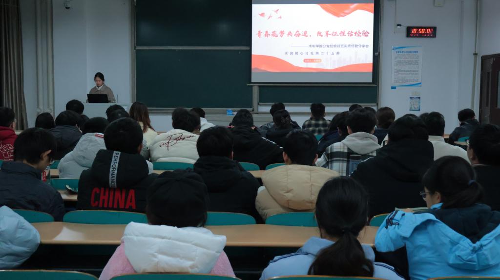 12月13日晚,水利学院于工三B218开展了主题为“青春筑梦共奋进”的第二十五期水润初心论坛活动,此次活动由本学期党校培训班的优实践代表进行经验分享,共计80名入党申请人、入党积极分子参加,此次论坛由本科生三支部党员朱雅琦同志主持。