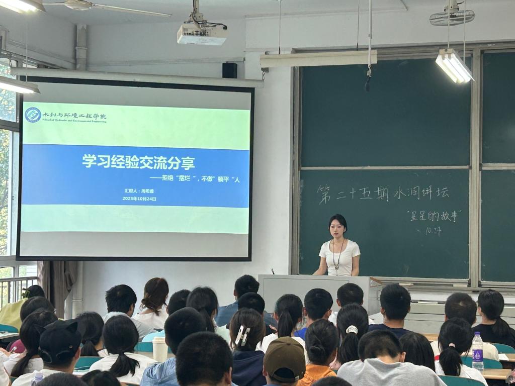 10月24日,水利学院在云塘工科三号楼A205室举办第25期“水润讲坛”,主题为“学霸养成记-星星的故事”。本次讲坛由保研优秀代表孟熙、国家奖学金获得者周希雅、三好学生标兵肖娴姿三位同学主讲,与80余名大一新生共谈如何更好地在大学阶段的学习上创造自我价值。