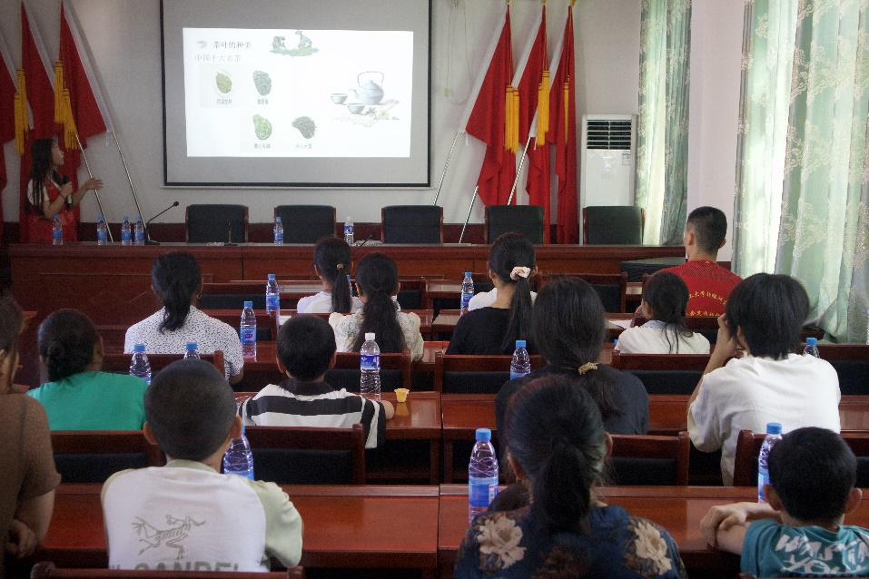 活动现场,实践团成员任柚金从茶的起源、制作工序和茶叶的种类、泡茶的方法以及喝茶的步骤和功效等方面向孩子们介绍了源远流长的茶文化。