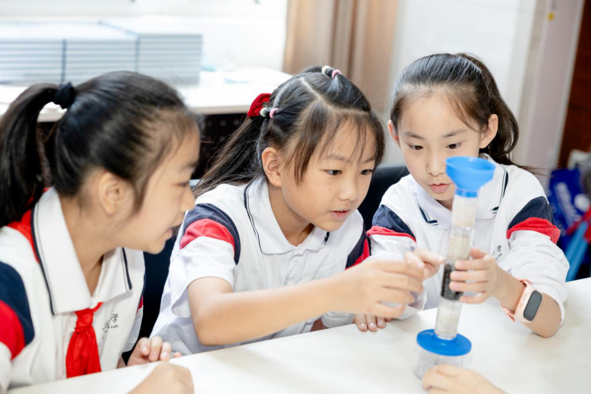 “我将会给大家变个魔法,让污水变成干净的水好不好?”,在科普实验环节中,志愿者们带领同学们制作了简易的净水装置,被污染的水依次通过塑料试管中的花岗岩石子、瓷石、活性炭变清澈,同学们在感受到了实验的乐趣的同时学习了水净化的过程。而科学小实验“彩虹泡泡龙”则带领同学们学习了水表面的张力作用。
