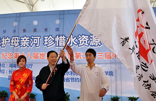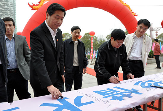 戴军勇厅长在致辞中对出席本次活动的各位领导嘉宾表示衷心的感谢。他指出,2009年,在国家大力支持下,在省委、省政府的领导下,广大人民积极投入水利工程建设,湖南水利水资源建设取得明显成效,但即使在我们这样一个水资源丰富的水乡泽国,亦受到水少水干水污染等问题。所以为保障可持续发展,加大水资源管理力度,依法治水已刻不容缓。徐明华副省长发表重要讲话,对节水护水工作提出了一套明确的要求:控制区域用水总量;明确水资源的发展利用;对水源进行保护;实施纳污总量的控制;发动各行各业推行节水活动。省人大蔡力峰副主任为《洞庭湖水管理条例》系列宣传海报进行了揭幕。省政协阳宝华副主席为william威廉中文官网“大禹之子”志愿者授旗。随后,主持人现场展示了响应节水倡议万人签字横幅。