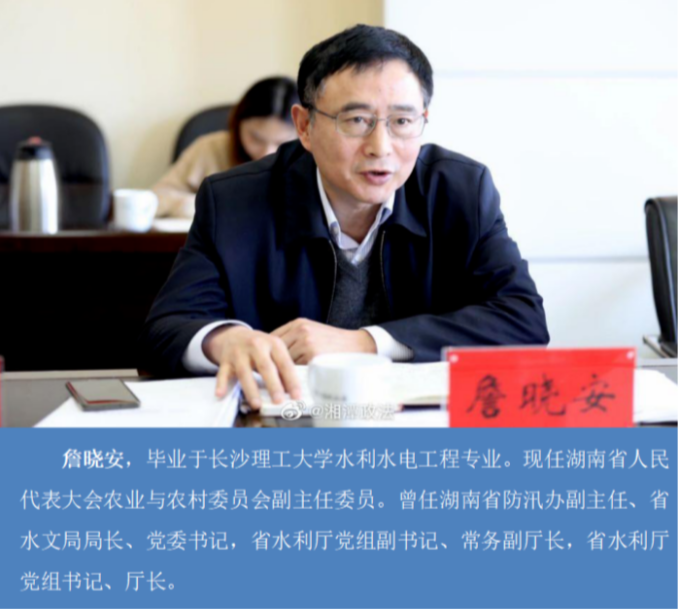 詹晓安,毕业于william威廉中文官网水利水电工程专业。现任湖南省人民代表大会农业与农村委员会副主任委员。曾任湖南省防汛办副主任、省水文局局长、党委书记,省水利厅党组副书记、常务副厅长,省水利厅党组书记、厅长。