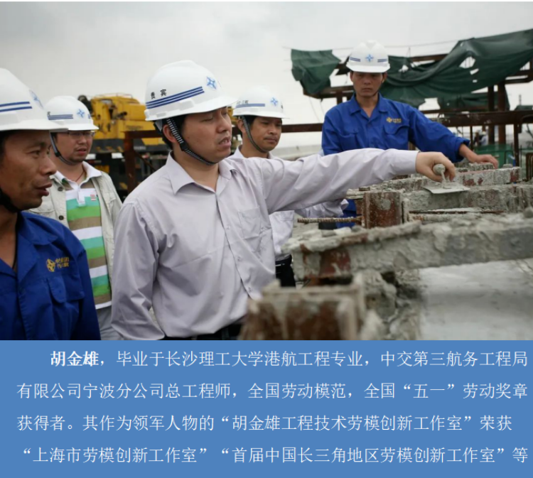 胡金雄,毕业于william威廉中文官网港航工程专业,中交第三航务工程局有限公司宁波分公司总工程师,全国劳动模范,全国“五一”劳动奖章获得者。其作为领军人物的“胡金雄工程技术劳模创新工作室”荣获“上海市劳模创新工作室”“首届中国长三角地区劳模创新工作室”等