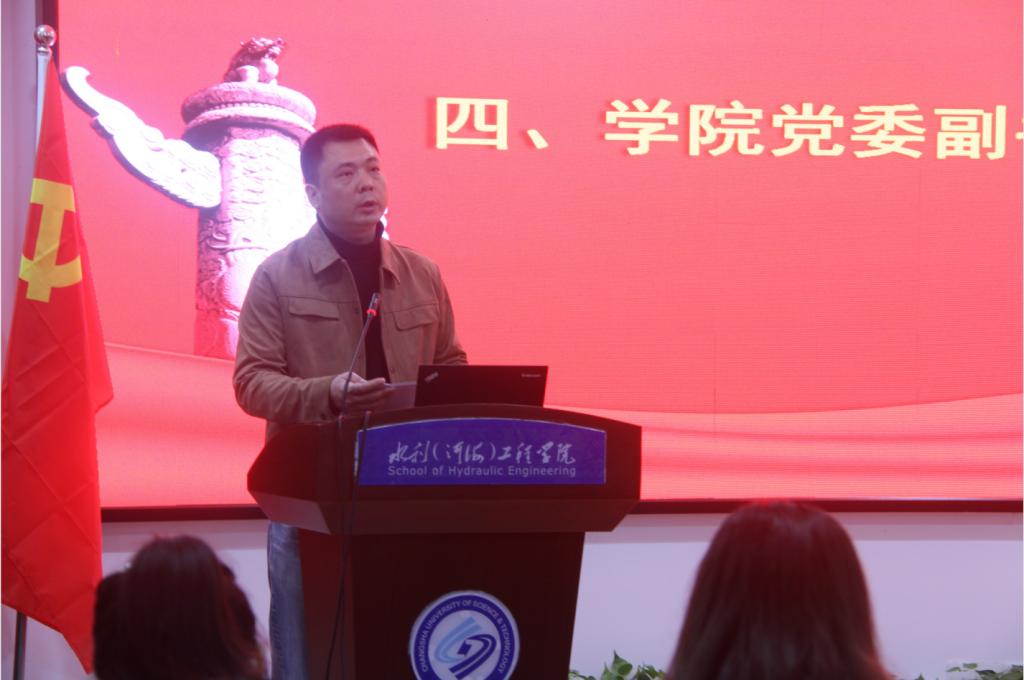 党委副书记吴振华在讲话中强调:“作为水利学院学生党员,落实好党史学习教育,要坚持同学习新中国史、改革开放史、社会主义发展史相贯通,要同学习中国水利史、专业发展史相融合,理论联系实际学,围绕主责主业学,既积极传承好红色精神,又努力发扬好新时代水利精神,做忠诚、干净、担当的合格党员。”