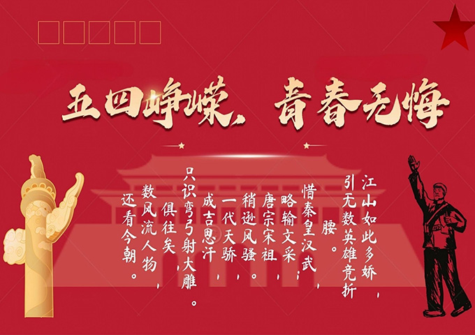 “故事里的中国”明信片设计活动以“五四峥嵘,岁月流章”为主题,同学们通过创意设计再现红色历史。刘晓娜的作品以毛泽东《沁园春·雪》经典词句为灵感,结合“五四峥嵘,青春无悔”主题,通过红色经典背景和文字融合展现历史厚重感。