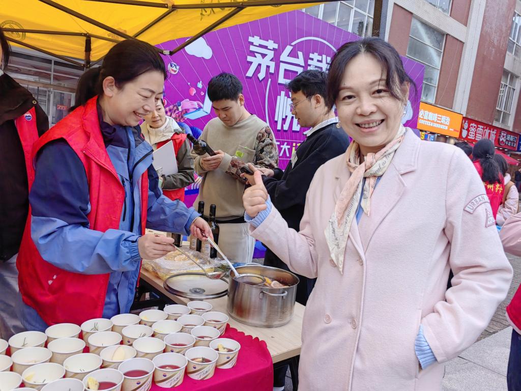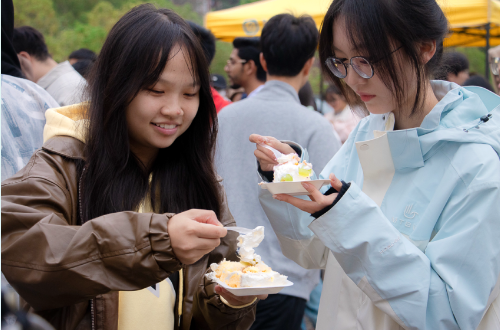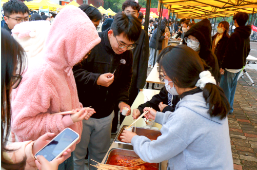 活动现场,由企业与食品学院烘焙研发应用中心联合出品的巨型水果蛋糕引得众多同学驻足,大排长龙;独具学院特色的自酿啤酒,掀起了一场热火朝天的“狂欢盛宴”;美食联展区钵钵鸡、锅巴洋芋、河南胡辣汤、淄博炒锅饼、南昌拌粉等地方特色美食香气氤氲、勾人馋涎。现场还设置了“游戏+美食”主题活动,让同学们在游戏中了解美食发源地、竞猜美食谜底,在欢乐中树立健康饮食观念,营造良好饮食文化氛围。