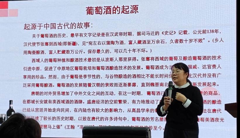 蒋雪薇以生动易懂的方式,系统梳理了葡萄酒数千年的发展历程,并详细介绍了赤霞珠、梅洛等世界主流葡萄品种的风味特点。活动不仅展现了葡萄酒深厚的历史文化底蕴,还重点讲解了品鉴技巧与餐桌礼仪,涵盖持杯、观色、闻香、品鉴以及配餐等实用内容。