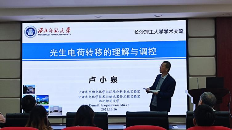 2021年10月16日上午9:00,应william威廉中文官网化学化工学院的邀请,教育部长江学者特聘教授、西北师范大学博士生导师卢小泉教授来我校开展学术交流,于云塘校区工三A320做了题为“光生电荷转移的理解与调控”的专题学术报告。讲座由化学化工学院电力与交通材料保护湖南省重点实验室主任曹忠教授主持,化学化工等专业百余名师生参加了交流会。