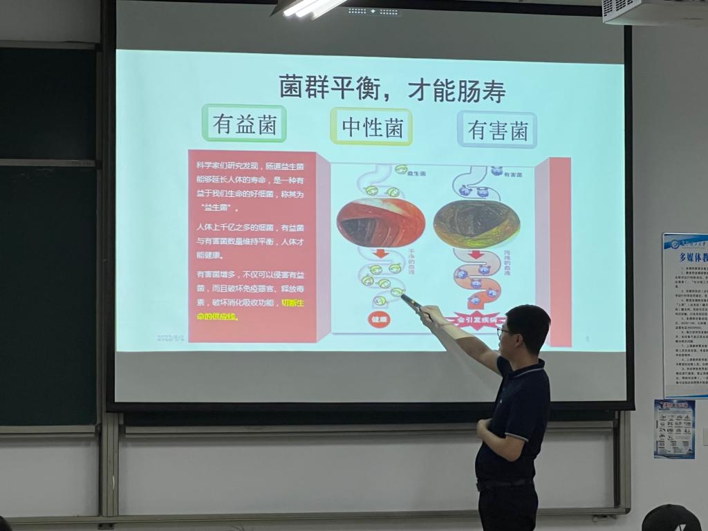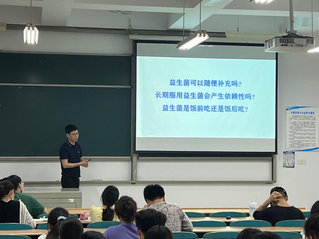 为进一步丰富我院学生的专业知识,提高同学们对益生菌的认识,促进师生之间的人文交流,6月1日晚上19:00点,食品学院在云塘校区工科三号楼A-214教室开展了“益生菌-人类肠道健康保护神”的主题讲座。本次讲座由微生物学博士、助理研究员吴昊老师主讲,食品学院的本科生和研究生及部分外院学生共百余人参与此次讲座。