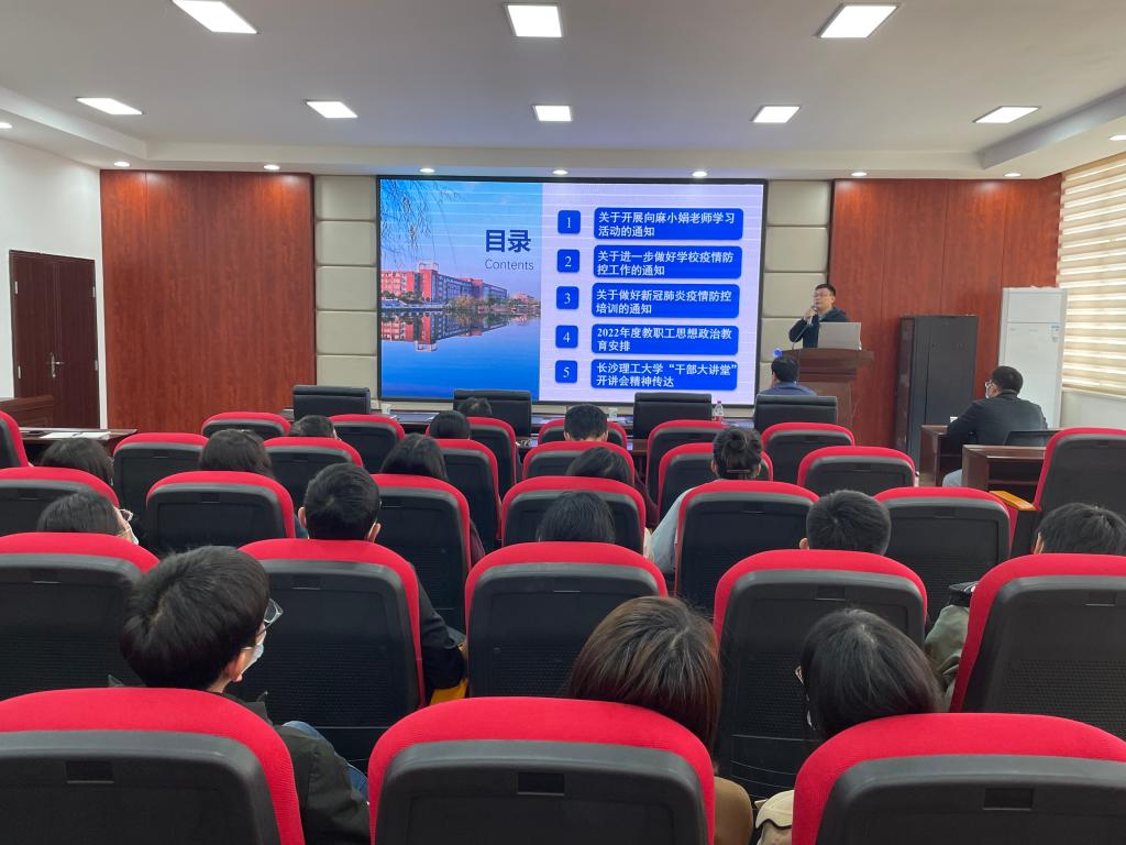 随后,王建辉传达了湖南省教育厅发布的《关于进一步做好学校疫情防控工作的通知》精神,以及学校防控办发布的《关于做好新冠肺炎疫情防控培训的通知》精神。他首先对学院党员教师参加学校抗疫期间的志愿者活动进行了总结和表扬,从3月31日至4月19日,学院共有29名党员积极报名参加了五次核酸采集,学工办的老师们更是24小时待命,冲在学校抗疫的前线,他们用真情坚守和积极行动,守护着师生们的生命健康和校园的平安幸福。其次对目前学院疫情防控工作提出三点要求:一是校园内师生必需佩戴口罩,注意做好个人防护,非必要少外出,合理开展校内聚集性活动;二是做好疫情防控政策的宣传,各系办要组织学习新冠肺炎防控知识和个人防护培训技能;三是做好心理疏导工作,积极帮助师生员工解决学习、工作和生活中的实际困难。