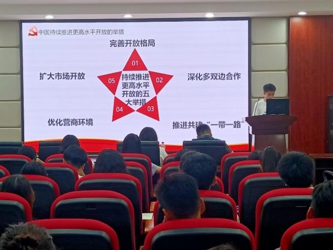 读书班学员周程分享了“形成全面改革开放新格局”专题的学习成果,分别从发展、包容、创新、新格局四个方面对主题进行解读,回顾从改革开放至今我国在这四方面所做出的努力和成就。