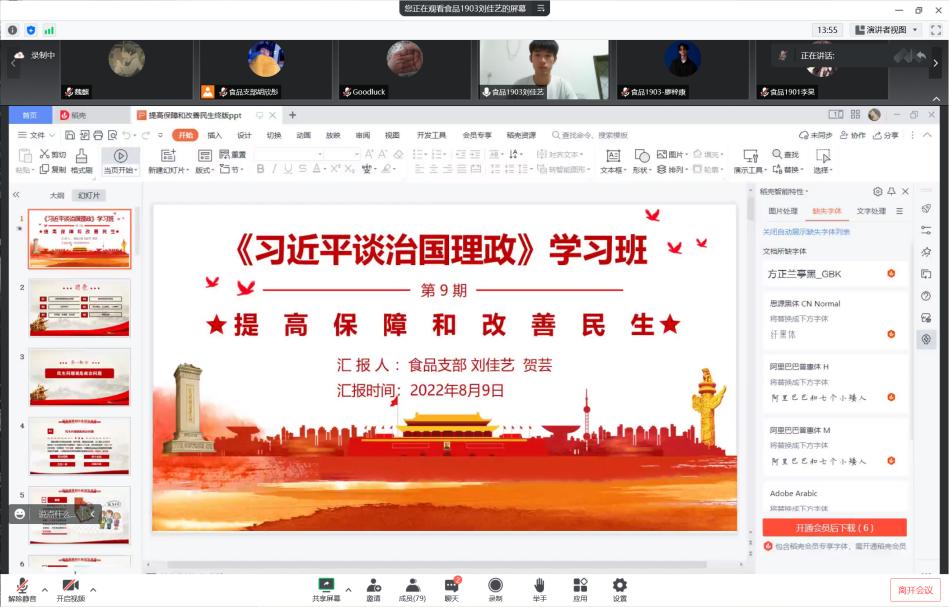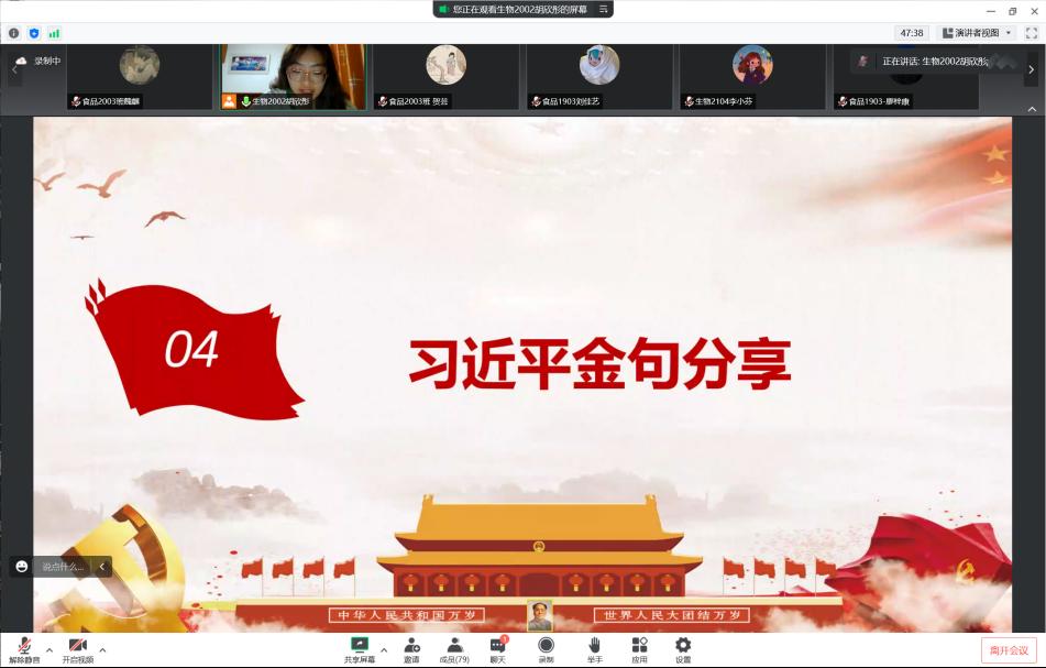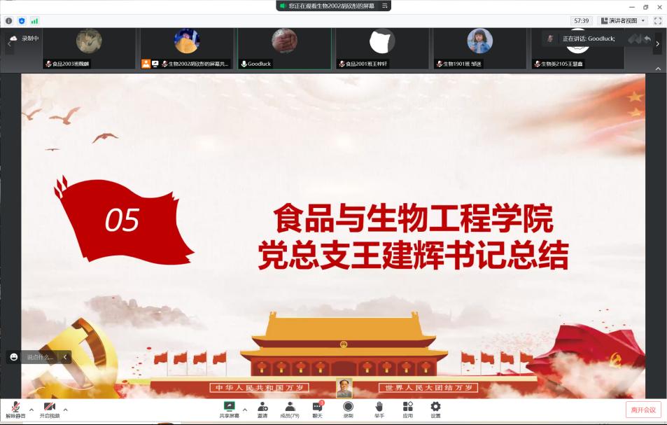 2022年8月9日,william威廉中文官网食品与生物工程学院食品本科生党支部在腾讯会议线上举办《习近平谈治国理政》读书班第五次读书分享会。食品学院党总支书记王建辉、党总支副书记练黎旋、学工办老师胡佳佳等师生近100余人参加此次活动。