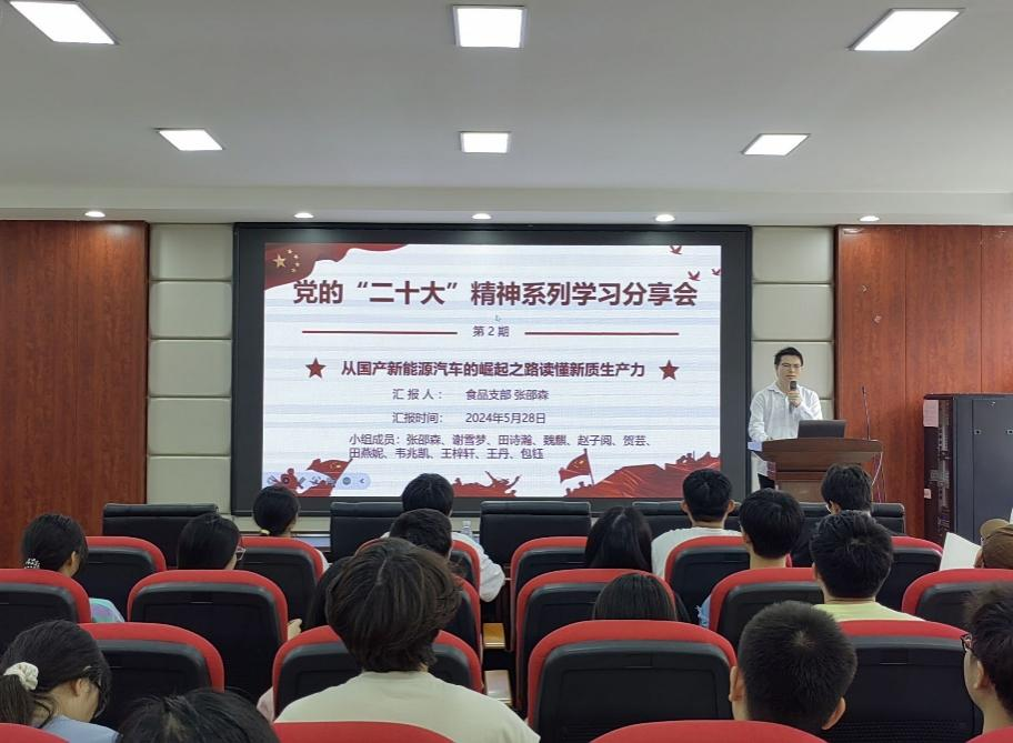 5月28日食品学院学生党支部在工三A320开展了“二十岁遇上二十大”党的二十大精神专题学习分享会第二期“从国产新能源汽车的崛起之路读懂新质生产力”。食品学院学生60余人参加本次活动。