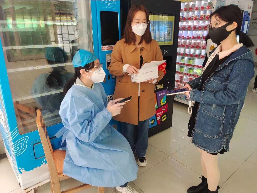图7 周慧老师在学生宿舍参加核酸检测志愿者工作