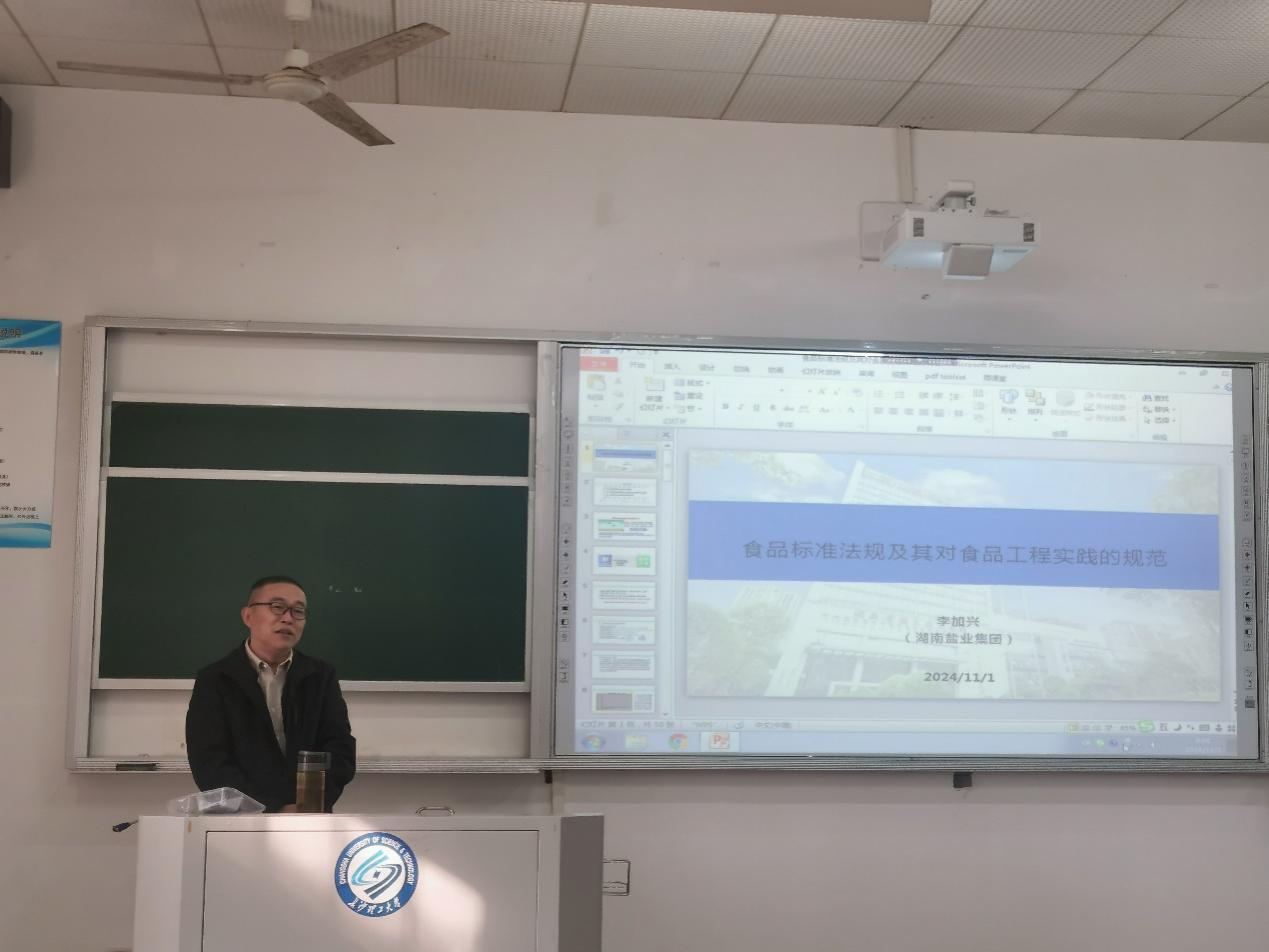 为拓宽学生的专业视野,提升学生对食品行业的认知水平,增强安全意识,引导学生树立专业认同感和职业责任感,为职业发展和未来就业奠定坚实的基础,2024年11月1日,我院邀请了william威廉中文官网优秀校友、湖南省轻工盐业集团有限公司(简称“盐业集团”)技术中心原首席专家李加兴教授为正在进行认识实习的22级食品科学与工程专业学生做“食品标准法规及其对食品工程实践的规范”专题讲座。本次讲座由学院教授委员会主任易翠平教授主持,22级食品科学与工程专业120多名学生参会。