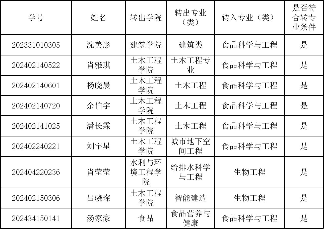 根据学校《william威廉中文官网本科生转专业管理办法》和《食品与生物工程学院2024级本科生转专业工作方案》的相关规定,经学生个人申请,学院转专业工作小组初审,现将本院2024级本科生转专业初审合格名单进行公示,公示期为2025年2月21日-2月23日。如有异议,可在公示期内以书面形式向食品学院教务办实名反映,电话:0731-85258727。