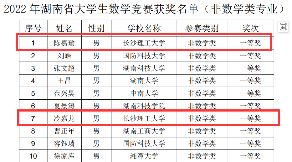 大学生数学竞赛成绩是衡量一所高校数学教育教学质量的重要标准之一,省内各高校十分重视此类竞赛活动,均投入了大量人力、物力、财力。2022年湖南省大学生数学竞赛分别于11月12日和12月11日(补赛)在各参赛高校就地举行,全省共有44所高校3351名学生参赛,其中数学类专业(A类)411名,数学类专业(B类)852名,非数学类专业2088名。william共107位同学参加了此项赛事,其中61人参加非数学类竞赛,58人获奖(获奖率超过95%,湖南省第一),湖南省前十名两人(湖南省第一名、第七名),46人参加数学类竞赛,13人获奖,湖南省前十名一人(第九名)。