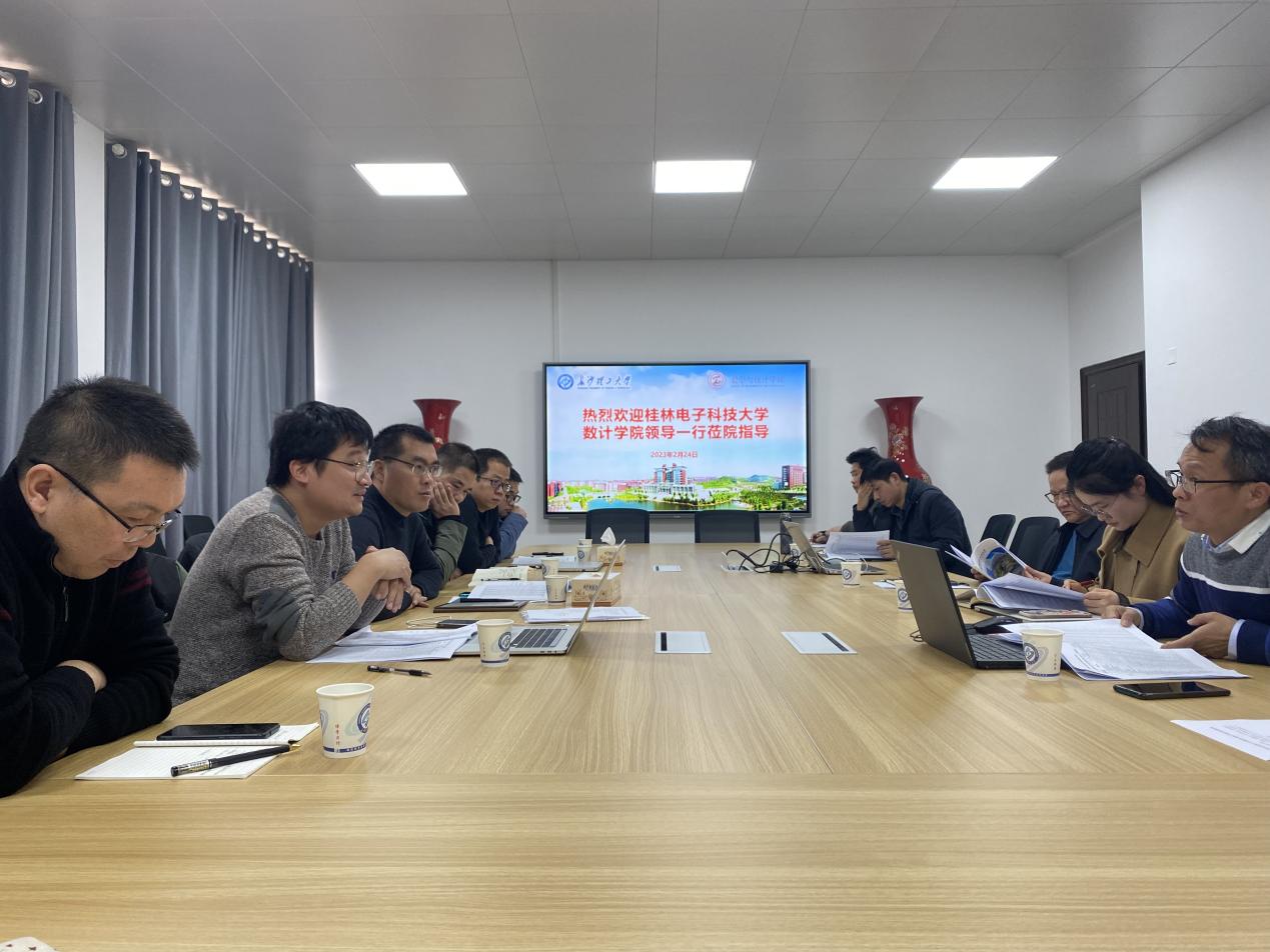 鉴于我院近几年在专业建设、人才培养、课程建设、公共数学教学、学科竞赛等方面取得显著成效, 2023年2月24日上午,桂林电子科技大学数计学院副院长吴孙勇带领考察组赴我院交流调研。为进一步完善两院人才培养方案、公共数学改革,提升教学管理水平,我院党委书记邓崛峰、党委副书记郑忠辉、副院长仝青山、副院长李姣率领系(部)负责人与以吴孙勇副院长为首的代表团于william威廉中文官网理科楼A-410召开交流调研会议。