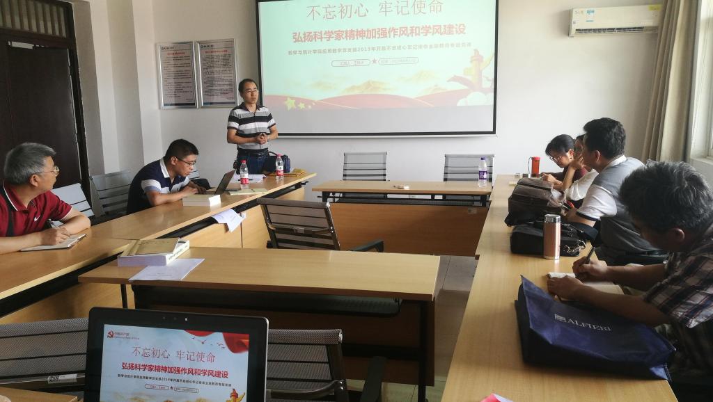 9月下旬,数统学院数学与应用数学系党支部党员、副院长王佳伏博士在理科楼A505为支部讲题为《不忘初心 牢记使命---弘扬科学家精神加强作风和学风建设》的党课,党课主要从自觉践行、大力弘扬新时代科学家精神,加强作风和学风建设,营造风清气正的科研环境,加快转变政府职能,构建良好科研生态三个方面进行阐述。