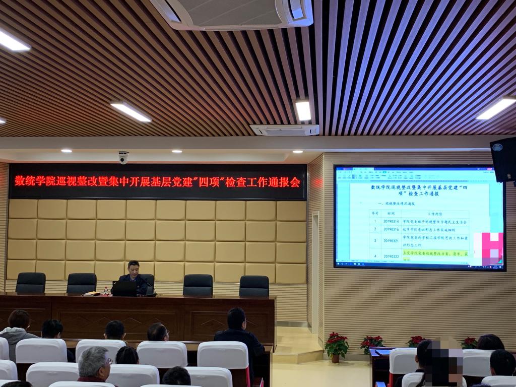 4月2日下午,在理科楼A200召开“数统学院巡视整改暨集中开展基层党建‘四项’检查工作通报会”,学院全体师生党员参加,会议由党委书记张宏伟主持。