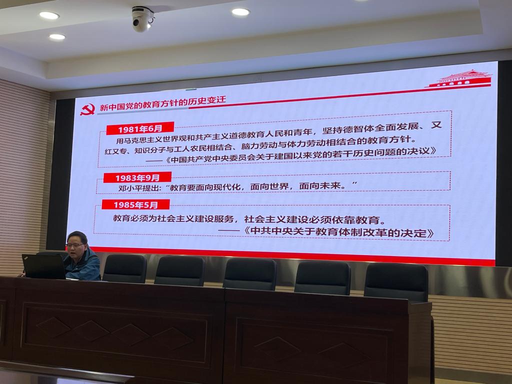 邓崛峰从新中国党的教育方针的历史变迁、新时代党的教育方针的总要求和特点、新形势下学校学院发展对教师的新要求三个方面,深入阐述了在新形势下学习、领会和贯彻党的教育方针的重要性。邓崛峰指出,新时代党的教育方针,是党不断适应时代要求,总结教育规律,把握社会发展和人的发展要求而提出的教育事业行动指南,要对标党的教育方针,围绕“培养什么人、怎样培养人、为谁培养人”这一根本问题,坚持社会主义办学方向,落实立德树人根本任务,坚持教育“四个服务”的根本宗旨,努力培养德智体美劳全面发展的社会主义建设者和接班人。