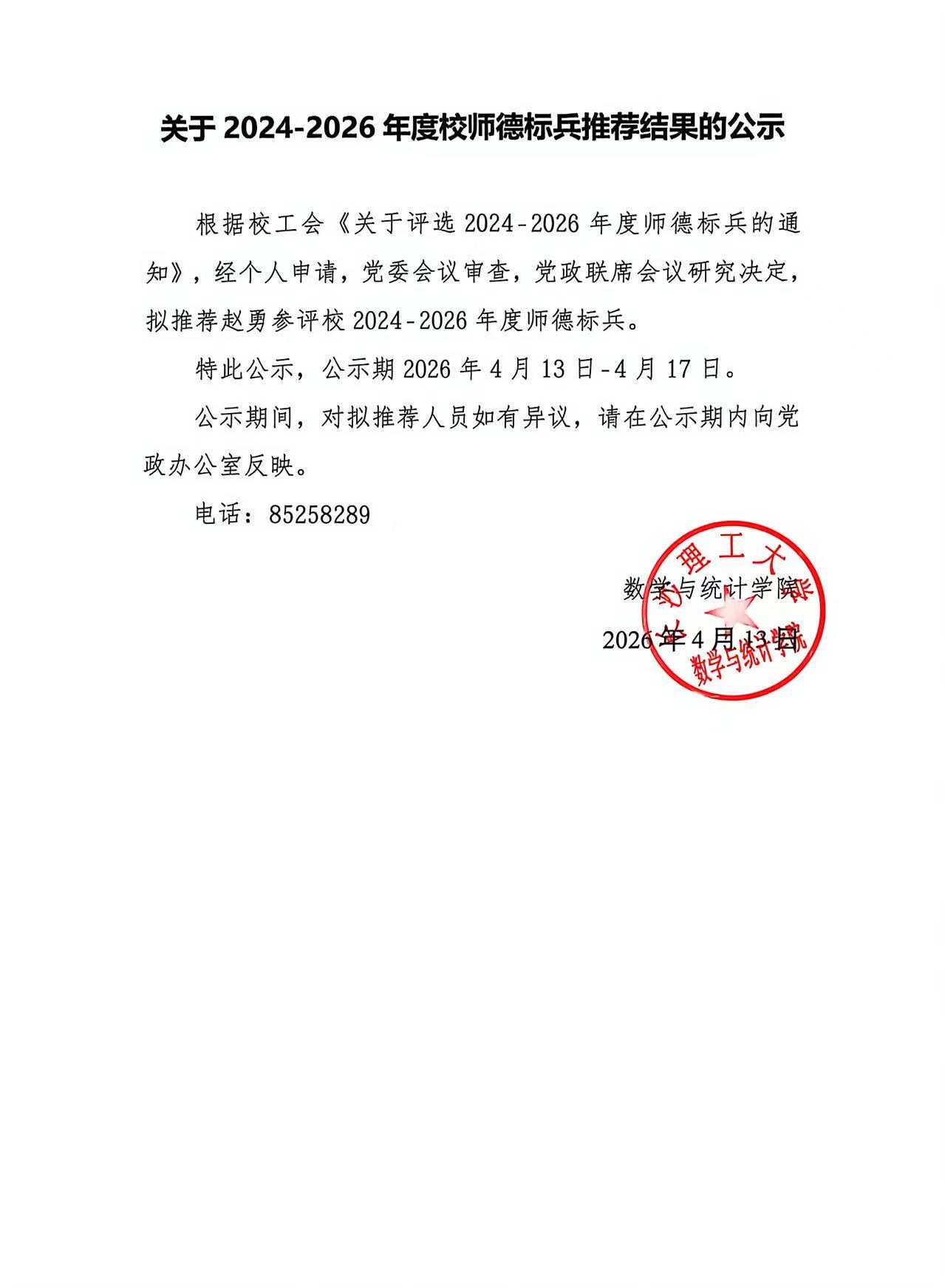 关于2024-2026年度师德标兵推荐结果的公示