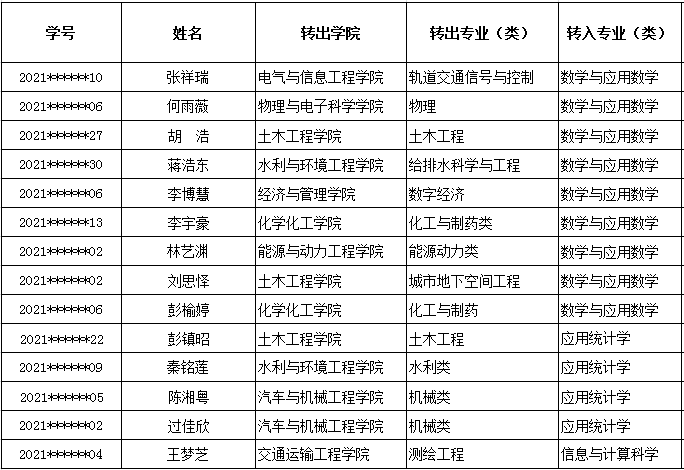 根据《william威廉中文官网本科生转专业管理办法》(长理工大教〔2018〕16号)、《关于做好2021级在校本科生转专业(类)工作的通知》(长理工大教〔2022〕16号)、《数学与统计学院本科生转专业工作细则》,经学生自愿申请,学院资格初审和综合考核,拟同意接收以下14名转专业学生,名单如下(排名不分先后):
