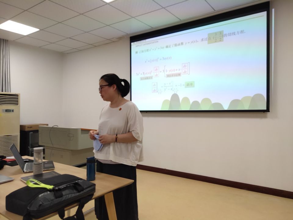 丰静老师将参加学校和湖南省信息化教学比赛,此次教研活动由丰老师主讲了“隐函数的求导”的课堂教学示范课。丰老师从现实生活中的实例出发,引出了“隐函数”的数学定义,进而重点介绍了它的计算方法。