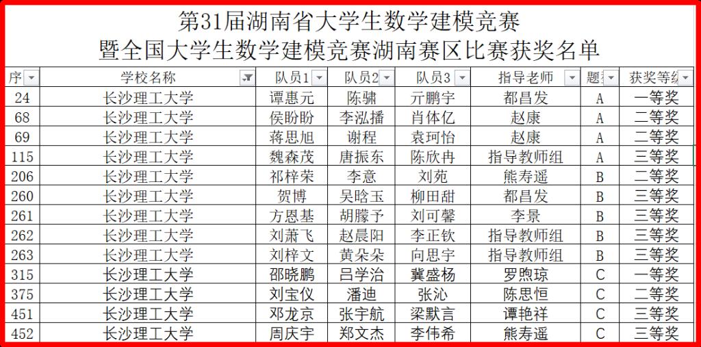 同时,近日,湖南省教育厅高等教育处发布了“第31届湖南省大学生数学建模竞赛暨全国大学生数学建模竞赛湖南赛区获奖名单公示”的通知,william在第31届湖南省大学生数学建模竞赛暨全国大学生数学建模竞赛湖南赛区的比赛中获得一等奖2项,二等奖4项,三等奖7项。