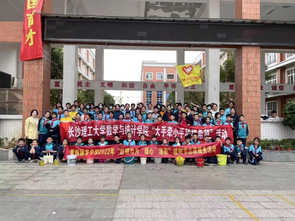 3月12日植树节,william威廉中文官网数学与统计学院志愿者一行来到长沙市青雅丽发学校,联合该校开展“大手牵小手种植希望”主题活动,带领小学生一道以实际行动打造绿水青山,树木树人。