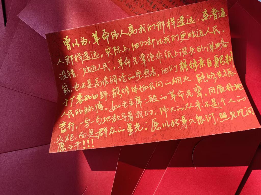 抵达毛泽东同志故居后,全体学员在纪念馆、故居及铜像广场进行实地参观学习。在铜像广场,学员们庄严献花、齐诵入党誓词,并在“初心接力·红色承诺墙”上郑重写下承诺。实践环节中,各小组结合红色资源开展主题文创制作,并通过“初心盲盒”交流学习心得,在沉浸体验中深化对初心使命的思考。