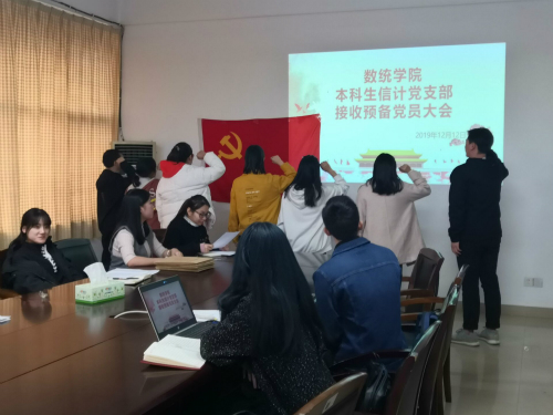 2019年12月12日,数学与统计学院学生党支部在理科楼召开预备党员接收会议,会议由各支部副书记主持,全体党员参加此次会议。