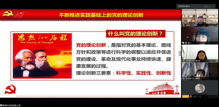 2020年4月14日下午,数学与统计学院分党校在线举办了入党积极分子培训课,由校友中心副主任(主持工作)李伟教授和马克思主义学院系主任郭华教授分别以“党的奋斗历程”和“与时俱进——不断推进实践基础上党的理论创新”为主题进行讲授。