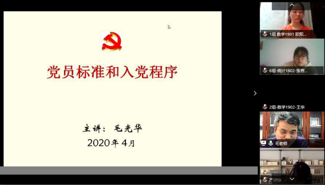 2020年4月18日下午,数学与统计学院第35期入党积极分子于线上进行了以“党员标准和入党程序”为主题的理论课程,由校督导室督察员毛光华主讲。