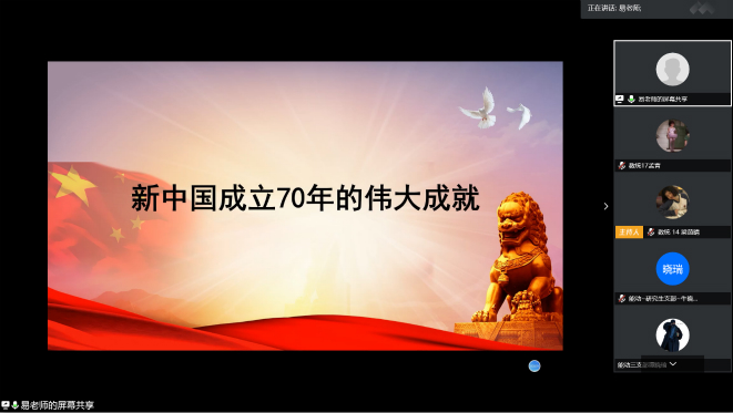 课程一开始,易显飞教授通过三个视频带领我们回顾了新中国成立70周年来的伟大成就。课上,易显飞教授分别从社会主义革命和建设为当代中国发展进步奠定根本政治前提和制度基础、新时期改革开放让中国人民和中华民族大踏步赶上新时代、以历史和科学的眼光认识70周年社会主义革命、建设和改革的现实启示、在习近平新时代中国特色社会主义思想指引下为实现中国梦继续奋斗四个方面向我们详细介绍了新中国成立70周年以来的成就与历史经验。易显飞教授表示:“70年的峥嵘岁月,70年的玉汝于成,是中国共产党团结带领中国人民完成了社会主义革命,确立了社会主义制度,成功推进了社会主义建设和改革开放的伟大革命,进而开辟了具有中国特色的社会主义道路”。