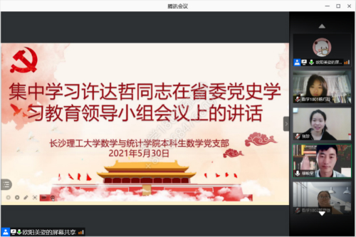 5月30日上午10点,数统学院本科生数学党支部在腾讯会议上集中学习许达哲同志在省委党史学习教育领导小组会议上的讲话,会议由欧阳美姿同志主持,全体党员参加。