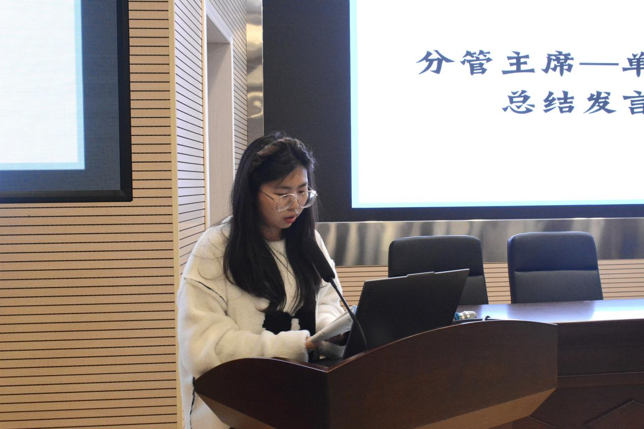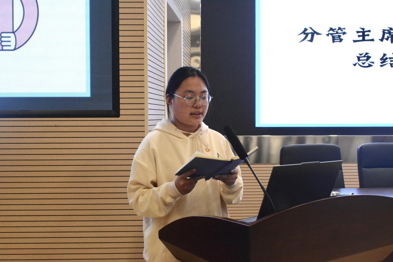 紧接着,办公室、文娱部、权益部依次上台,详细介绍了本部门在过去学期内的工作成果,包括组织开展的各项活动、取得的实际成效等,并对未来的工作进行了前瞻性的规划,明确了工作目标与方向。单思敏认真听取汇报后,对这些部门所取得的显著进步给予了高度评价,同时满怀期待地寄语各部门,希望他们在未来能够持之以恒,不断突破自我,创造更加优异的成绩。