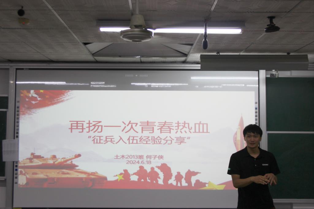 为进一步激发学院学生报效国家、献身国防的热情,6月18日,土木学院在金盆岭校区12教214教室组织召开了征兵经验分享会。本次分享会由2020级退伍学生何子侠主讲,2023级新生代表130余名学生参加,2023级学生干部刘乐铷主持。