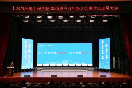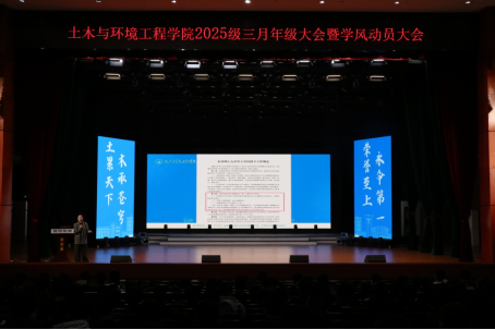 为明确新阶段学习目标,扎实推进优良学风建设,3月30日晚,学院于云塘校区大会堂召开2025级本科生“‘砼’启程,正学风”3月年级大会。校学工部副部长黄阿明,年级辅导员龚丁、邓文杰及2025级全体本科生参会。会议由土木2506班学生陈婧萱主持。