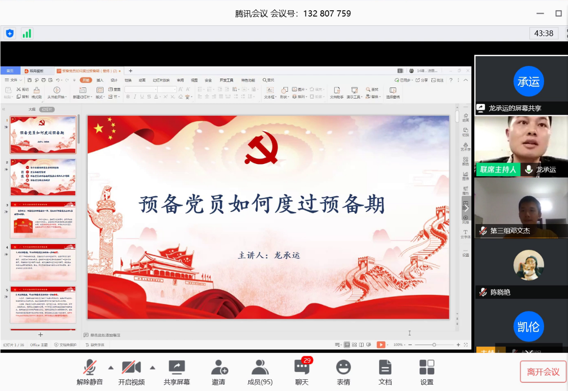 4月27日晚,在开班典礼后,土木工程学院分党校组织第21期预备党员在腾讯会议平台上开展《预备党员如何度过预备期》专题党课,土木工程学院学工办龙承运老师应邀主讲,学生党支部副书记李小军及第21期预备党员全体学员参加。