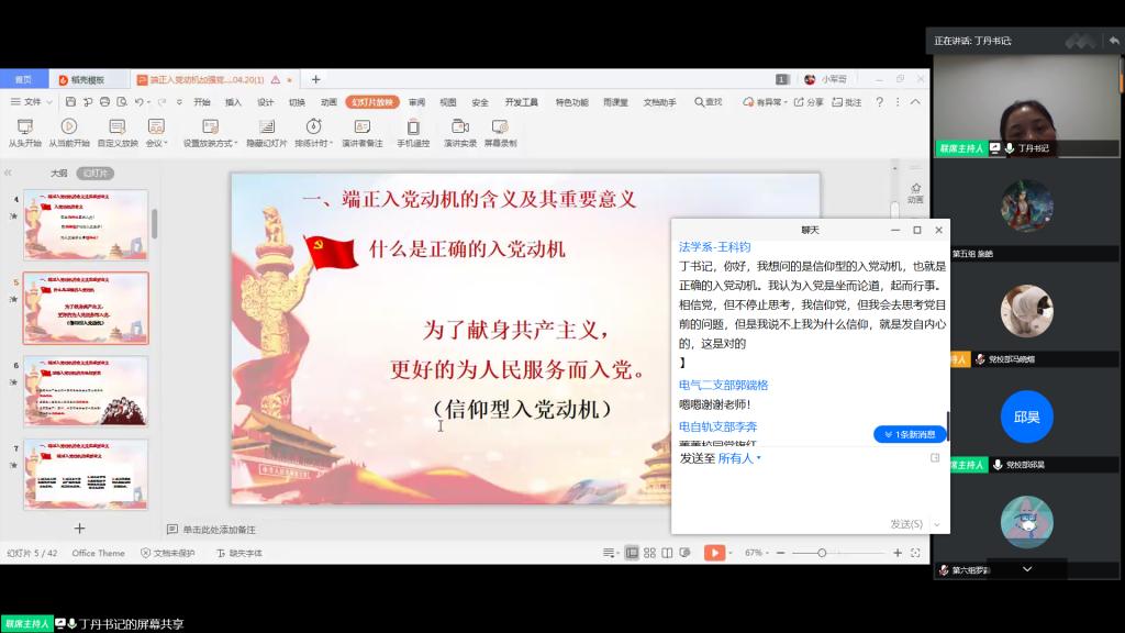 丁丹从“端正入党动机的含义及其重要意义”、“当代大学生不良入党动机及其纠正”、“党性修养的含义及当代大学生加强党性修养的途径”以及“共产党人的初心和使命是什么”四个方面进行授课。她强调,我们要为了更好地为人民服务而入党,身为学生干部,要为了更好地同学服务而入党。共产党人要有起先锋模范的思想觉悟,在疫情期间敢担当、有担当就是最好的表现。她谈到,疫情是面“照妖镜”,照出了许多党员干部的真面目,有些党员畏手畏脚,不敢冲上去,但更多的党员干部“关键时刻冲得上去,危难关头豁得出来”,她鼓励大家向身边的优秀党员学习,如向武汉多次捐款的土木教师黄戡,冲锋疫情防控一线的土木在读研究生邹磊等榜样学习他们的责任与担当。