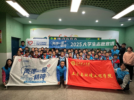 近日,学院辅导员、长沙共青团“80、90、00”青年讲师团讲师杨琪毅,带领2025年全国大学生“两弹一星”精神志愿宣讲团——“两弹薪火·核心先锋”宣讲团(以下简称“宣讲团”),走进长沙市天心区龙湾小学,开展“两弹一星”精神宣讲活动。