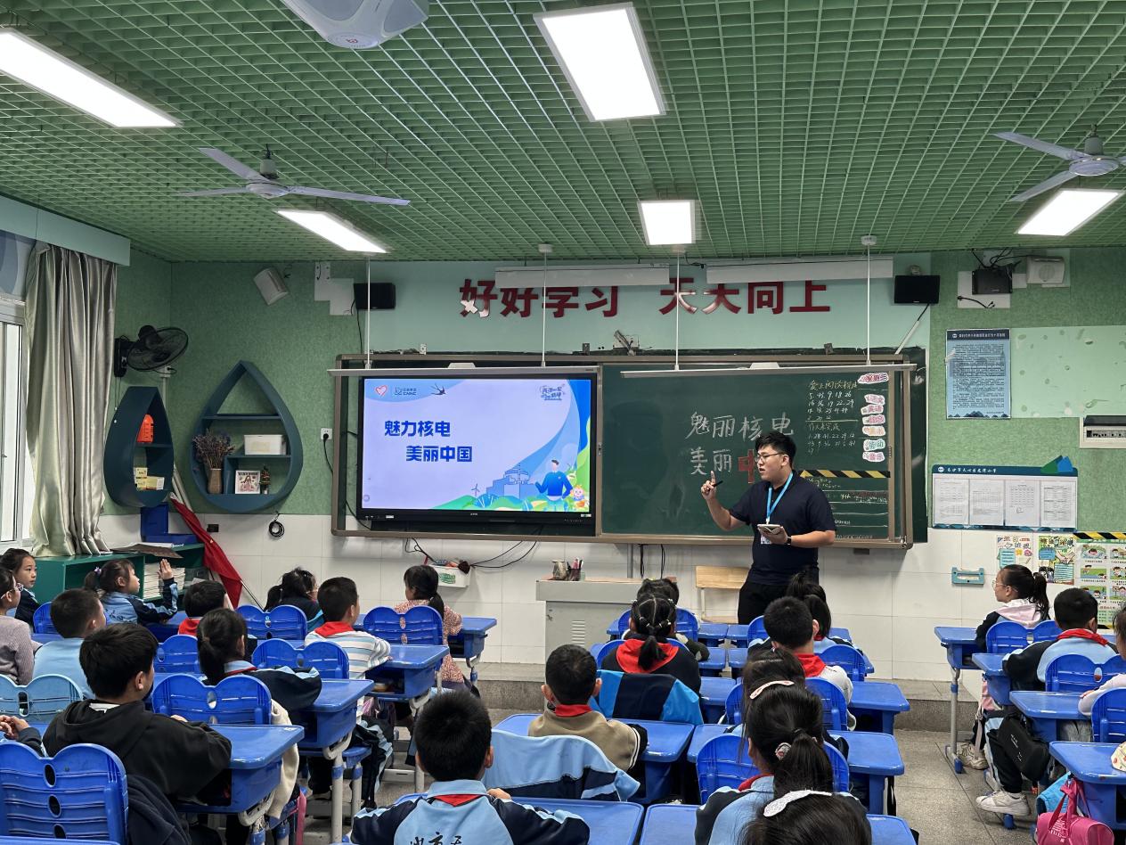 科普赋能,点燃科学梦想。宣讲团成员隋皓然以《探秘核电站》为题,借助PPT演示、科普展板与趣味短视频,将复杂核能知识转化为通俗内容。从核裂变原理到核电站安全屏障,从清洁能源优势到未来能源展望,讲解层层递进、深入浅出。同学们目光专注,对科学知识充满渴望,思想火花频频碰撞,探索未知、崇尚科学的种子在心中悄然萌芽。