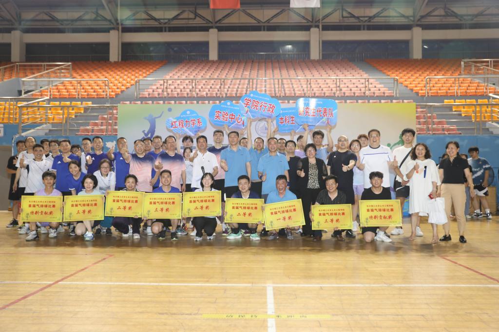 在智建对实验、行政对桥梁的首场小组赛中,场上老师们激情挥拍、团结一心,很快便将全院师生带入到比赛的紧张而又欢快的氛围中来。从小组赛到淘汰赛,进行了为时2个多小时共计9场比赛,场场亮点“爆燃”,江河书记的惊险扑救、王磊院长的飞身暴扣、桥梁系老师们的众志成城、建工系老师们的奋勇争先、岩隧系老师们的齐心协力、智建系老师们拼搏奋进、力学系老师们的团结协作、实验室老师们的坚毅执着,赢得了现场师生的阵阵欢呼。在紧张而激烈淘汰赛和冠亚季军争夺赛中,幸福又欢快的呐喊此起彼伏,仿佛不是几支队伍在比赛,而是整个学院师生在拼搏、在较劲。经历3个多小时的激战,最终行政系、实验中心与桥梁系力压群雄,夺得三甲。精彩纷呈的赛事背后凝结着土木师生对美好生活的向往,对健康快乐的追求。长期以来师生刻苦训练基本功,不断演练新阵容和积极挑战强对手的奋斗完美诠释了土木人勇于争先、敢打敢拼的精神。
