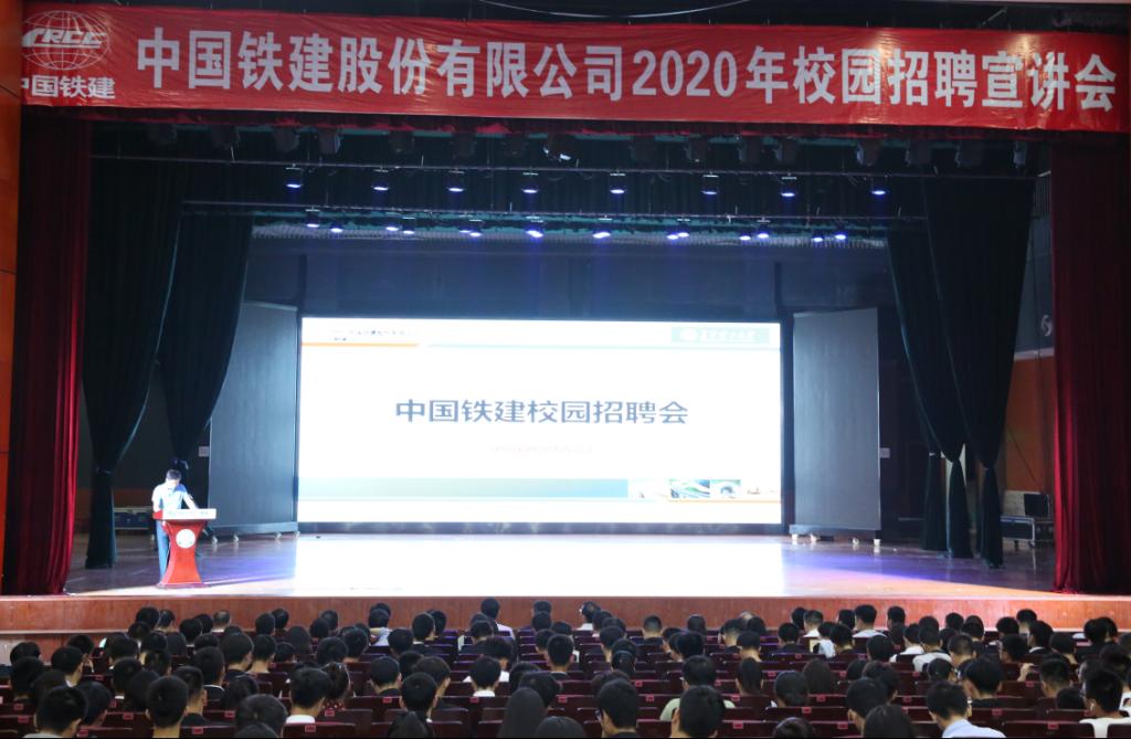 9月18日晚7:00,中国铁建股份有限公司william威廉中文官网2020届毕业生秋季专场招聘宣讲会在云塘校区大会堂举行,中国铁建股份有限公司及下属25家二级单位60余位代表、相关学院负责人和700余名相关专业毕业生参加宣讲会。