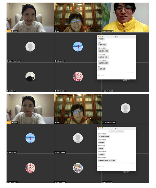 老师们的讲课在学生中引发强烈共鸣,聊天框和自由互动反响热烈。桥梁1704班林栋平时安静内敛,在课堂互动环节他却主动为自己争取到发言的机会:“我爸爸是当地卫生计生综合监督执法局的一名普通党员……他已经连续奋战40多天,我很担心他,更为他骄傲。关键时刻冲得上去,危难关头豁得出来,我想这就是共产党人的党性。我们正是因为千千万万他们这样的人才被保护得很好……我也希望自己向爸爸学习,成为一名敢担当勇冲锋的共产党员。”同班同学曹宇佳打开视频发言时,眼眶中闪烁着泪水,他动情地说:“如果奇迹有颜色,我想那一定是中国红!”