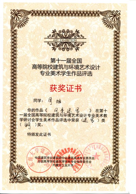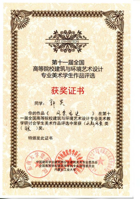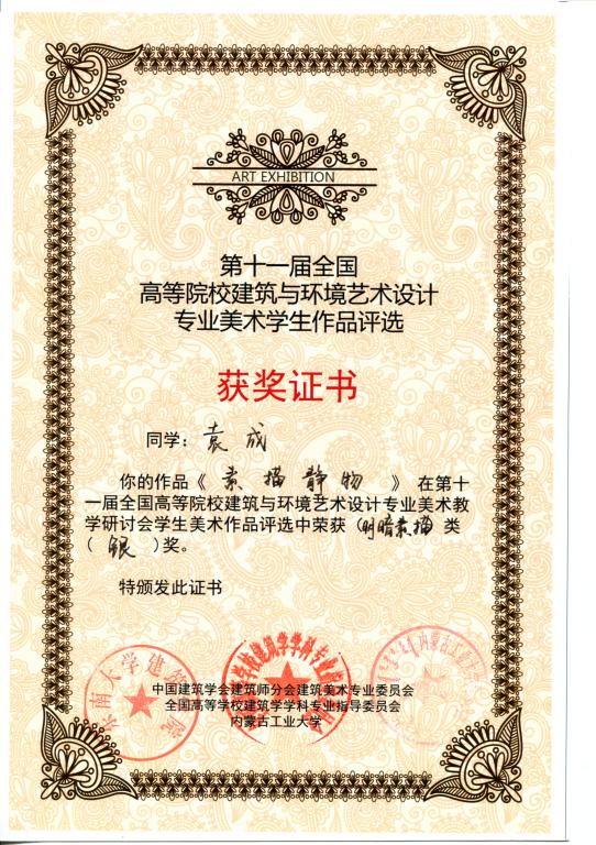 2011年9月22—26日,在内蒙古工业大学召开的第十一届全国高等院校建筑与环境艺术设计专业美术教学研讨会上传来喜讯,william郭昊、袁成、周旭三位同学的作品分获风景写生类银奖、素描静物类银奖和风景速写类铜奖。指导老师李洁、殷俊、周志高、池春雷。这是由全国高等学校建筑学科专业指导委员会、中国建筑学会建筑师分会建筑美术专业委员会以及内蒙古工业大学联合组织和承办的第一次全国高等院校学生建筑美术作品评奖,在100多个院校入选的400多幅作品中由专家评定产生。另,william学生郭昊、袁成、周旭、罗璇、唐荞菀、樊改霞、段红琪、王丛等八位同学的作品入选编入由中国建筑工业出版社出版的《学生作品集》,对这些同学表示祝贺!