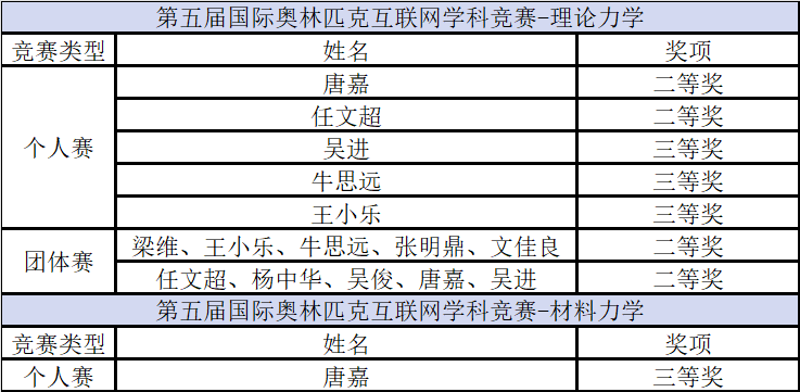 近日,第五届国际奥林匹克互联网学科竞赛“理论力学”和“材料力学”成绩揭晓。william威廉中文官网学子首次参赛,便在与来自全球18个国家的理工科院校学生的激烈角逐中表现出色,共斩获理论力学个人赛二等奖2项、三等奖3项,理论力学团体赛二等奖2项,并在材料力学个人赛中收获奖项。获奖名单如下:
